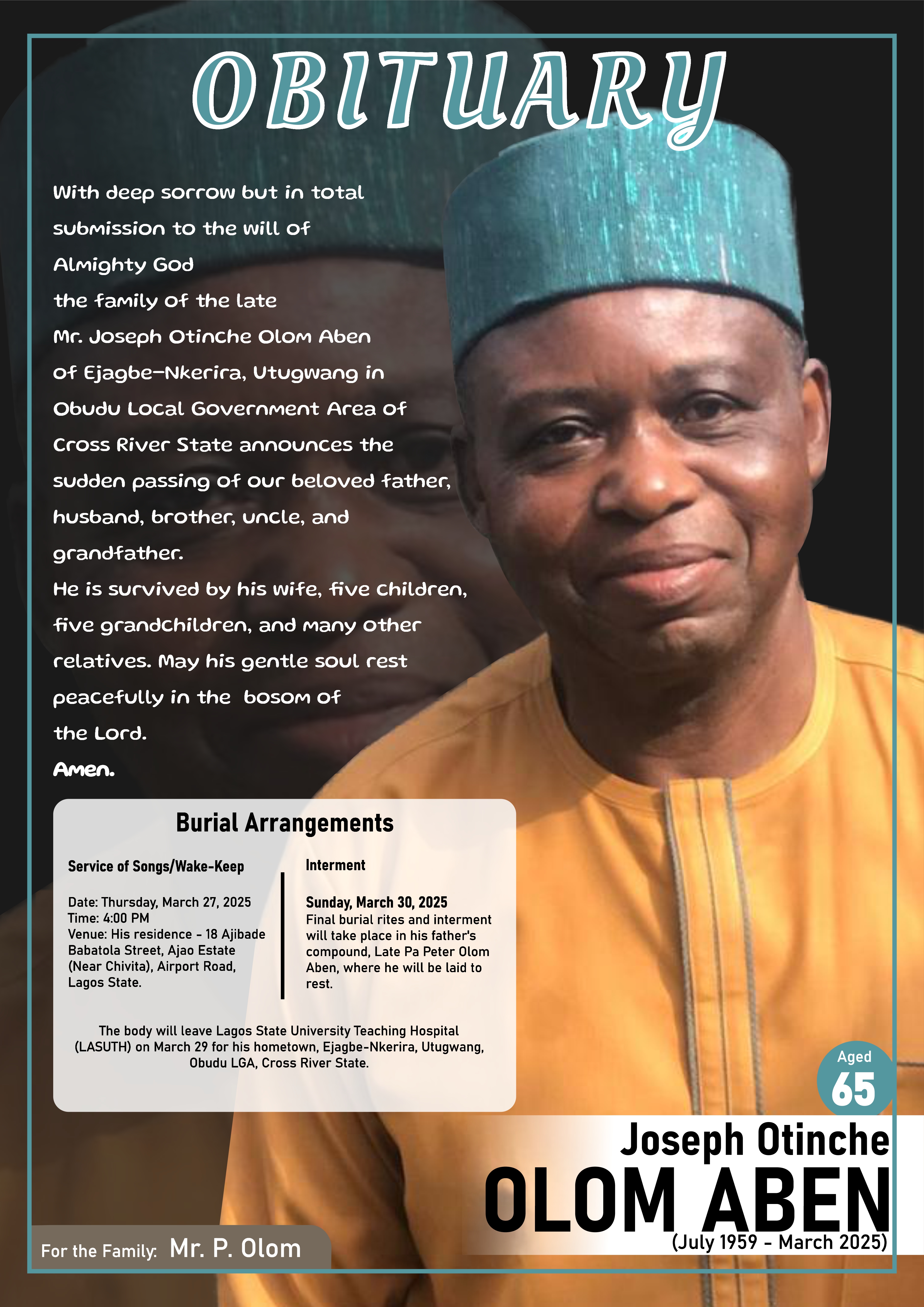 Though he is no longer with us physically, his spirit remains in every sunset he taught us to appreciate, every problem he helped us solve, and every tradition he lovingly upheld. We find comfort knowing that his influence continues through all of us who had the privilege of calling him Dad, husband, friend, and mentor.